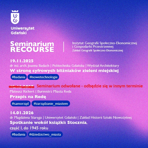 Seminaria RECOURSE są projektem własnym Zakładu Geografii Społeczno-Ekonomicznej UG, będącym kontynuacją działalności Centrum Doskonałości RECOURSE (Research and Education Centre for Urban Socio-Economic Development). Odbywają się nieregularnie w środy między 13:00 a 15:00 i są otwarte dla wszystkich zainteresowanych. W tym semestrze zapraszamy na seminaria w formule hybrydowej (szczegóły w harmonogramie poniżej).